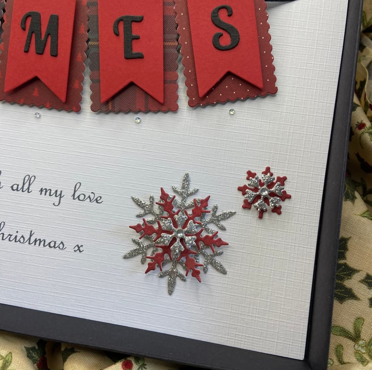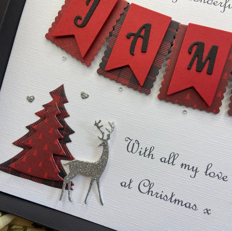 This handmade personalised Christmas card is A5 in size ( 210mm x 150mm) and is on 300gsm heavyweight linen card. I can fit up to seven letters on the bunting. This card can be for any relation or friend and the text above and below the bunting can be changed for you.