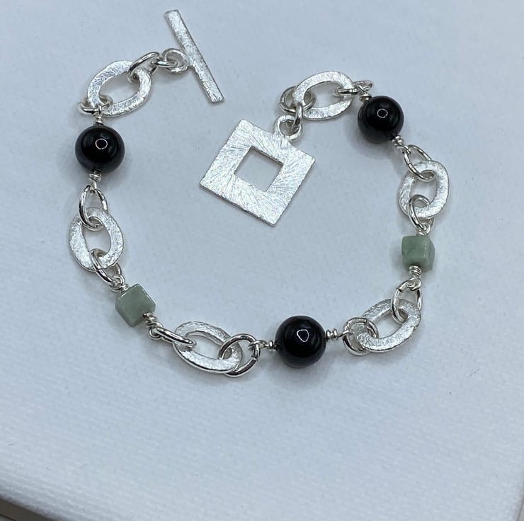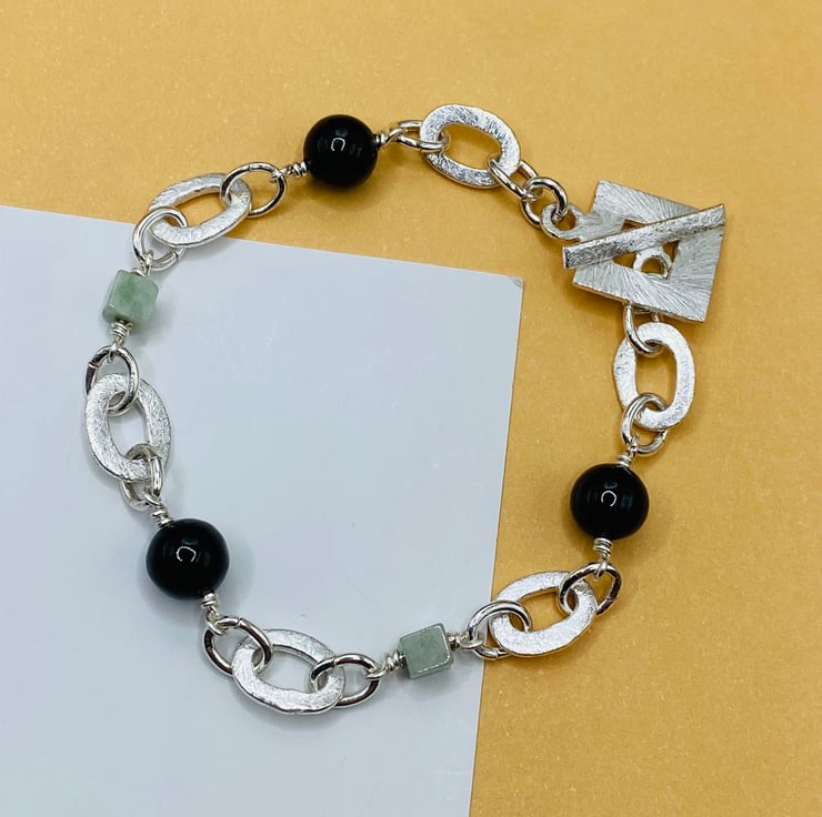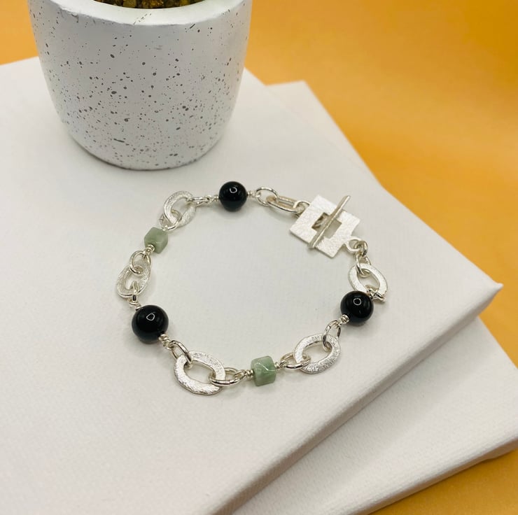 Featuring high-quality Type A Burmese gemstones, I've combined 8mm black jadeite rounds with 4mm green jadeite cubes in this bracelet. Everything is linked together using silver plated wire and I've added some chunky oval connectors and square toggle clasp, both silver plated and stardust textured, to give a sleek, contemporary touch to the design.