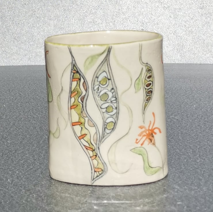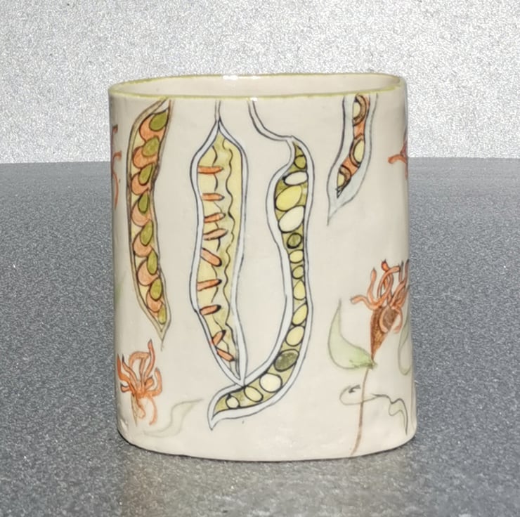 Stoneware glazed vase or utensil holder with hand-painted design by Kathleen Hepworth