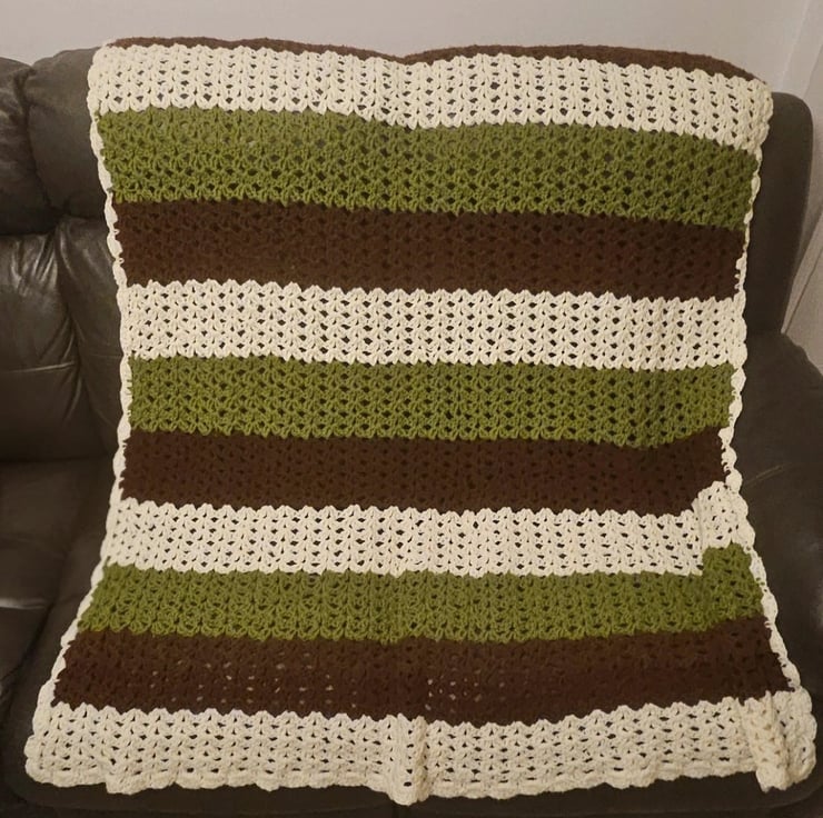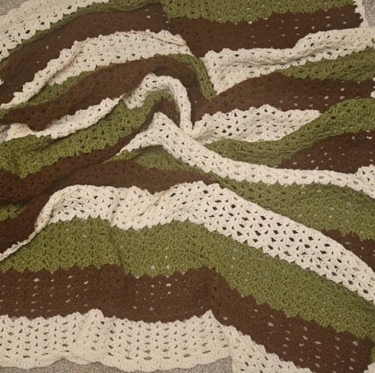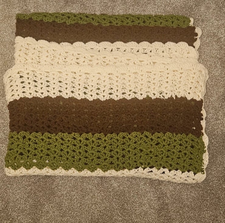 A beautifully handmade crochet blanket in warm, earthy tones — cream, olive green and chocolate brown.