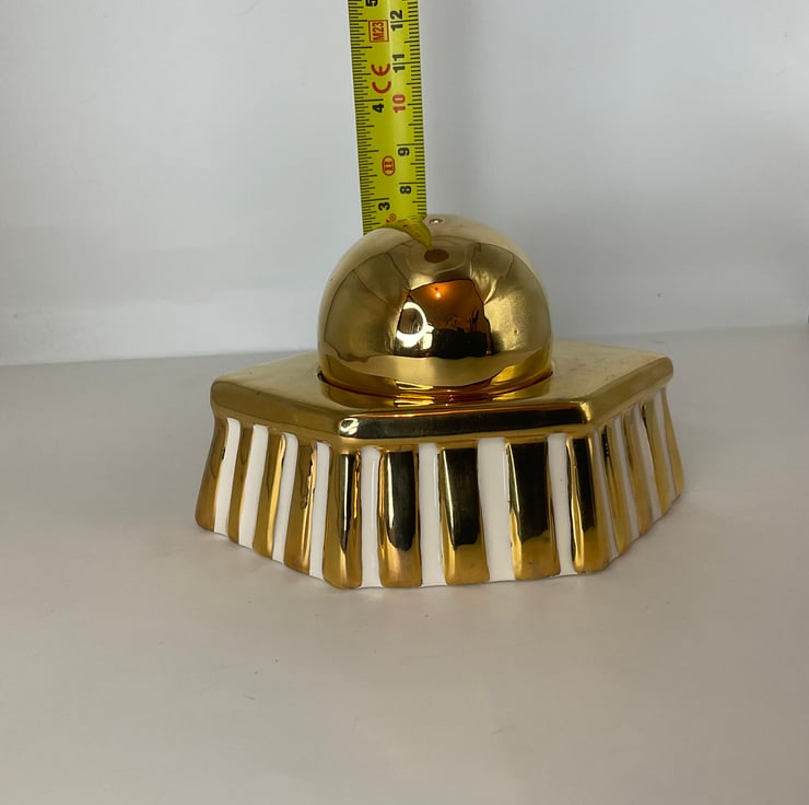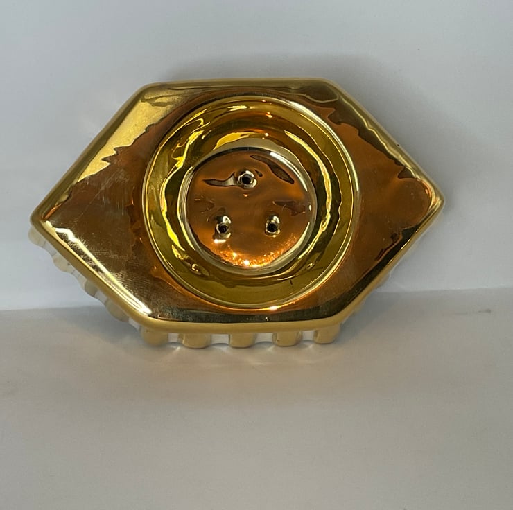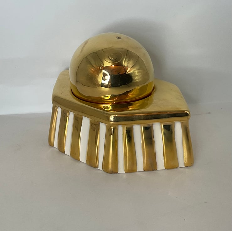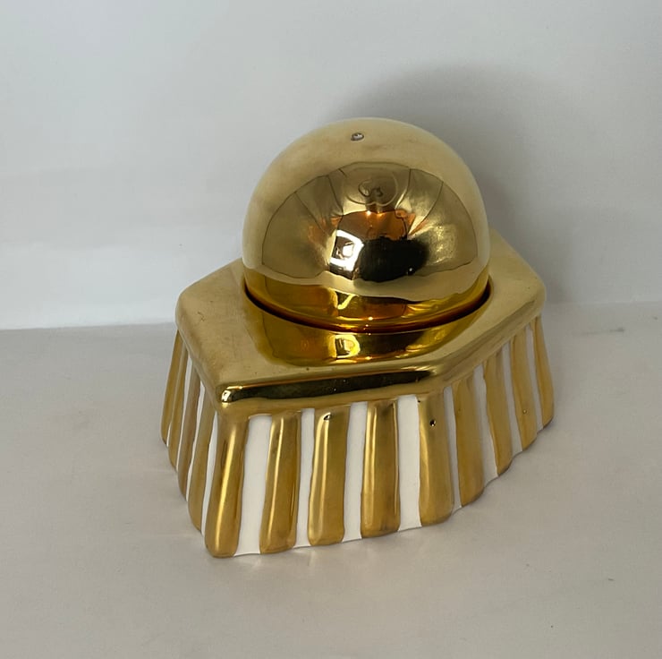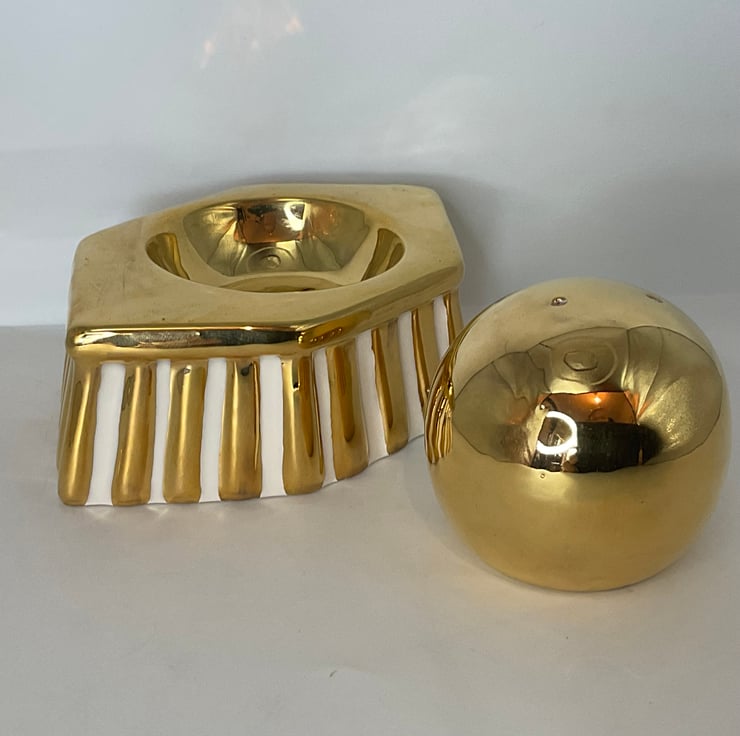 This is a two piece stacker salt and pepper shaker set I’ve entitled ‘Sunrise’.The golden globe ( salt)lifts out of the base ( pepper )it sits in.