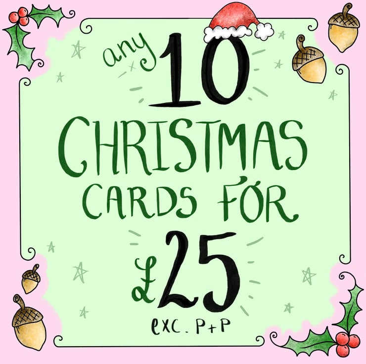A bundle deal of ten Christmas cards, and you can choose whichever cards you like! Please check the cards available in my shop and message to let me know which ten you want. (You can also choose a non-Christmassy card if you like, I won't mind!).