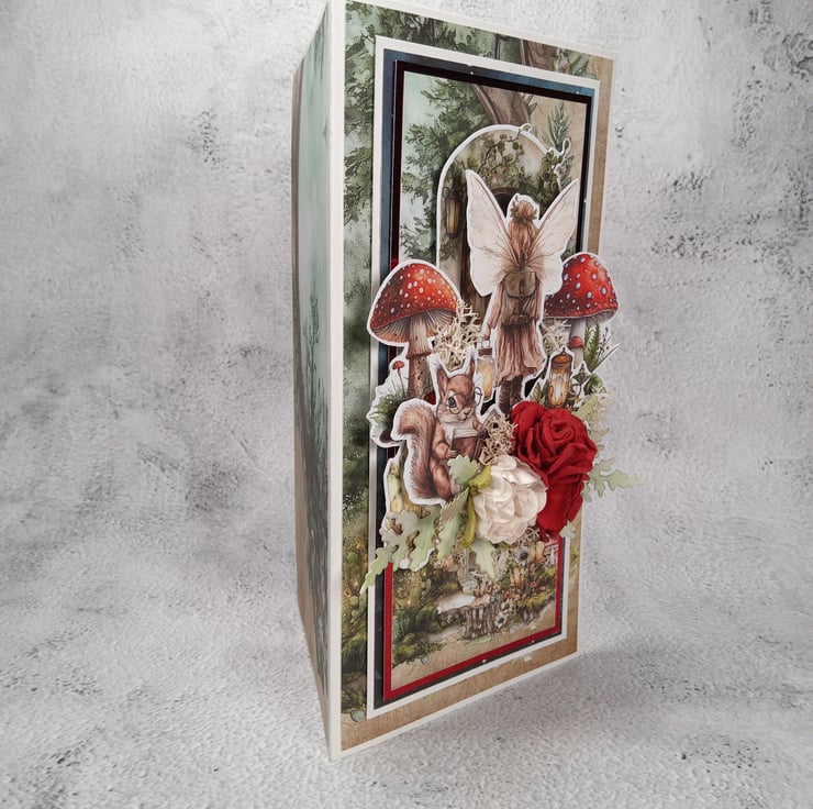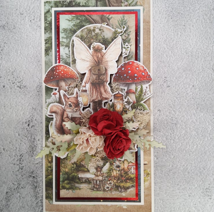 Step into a magical woodland with this beautifully layered handmade card featuring a fairy with delicate wings, surrounded by red toadstools, a curious squirrel, and forest greenery. The rich composition includes handmade paper flowers, natural moss, and shimmering red foil accents — creating an enchanting three-dimensional scene.