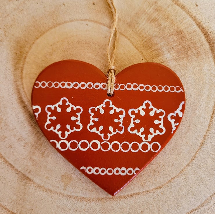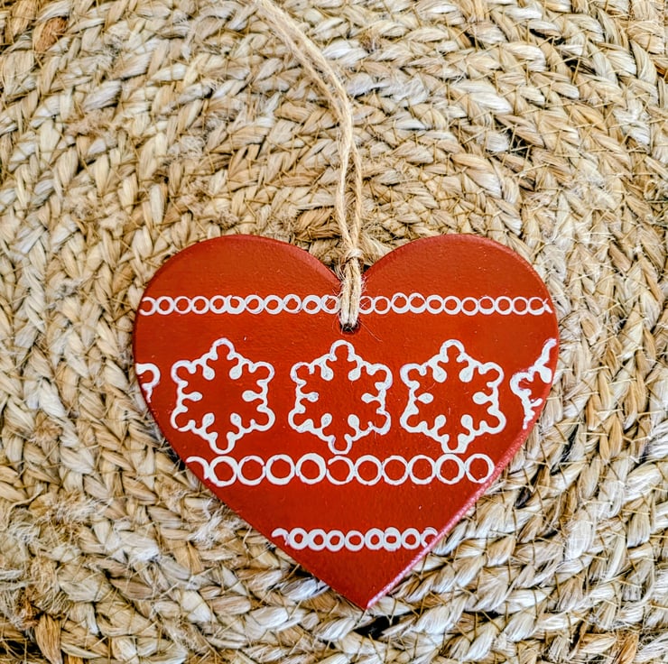 The festive hanging heart decoration is a beautiful shade of red, decorated by hand with vanilla cream and taupe festive patterns. The decoration consists of a lovely snowflake pattern and pretty circles to form a stripe pattern on the heart decoration. It is tied with a string loop which adds a natural touch to the piece.
