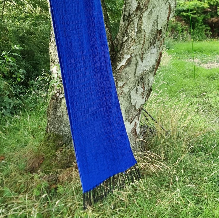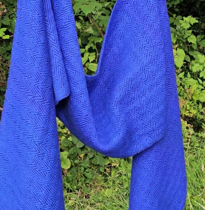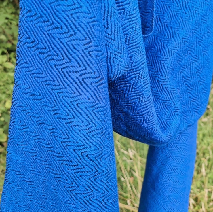 This very generously-sized handwoven scarf uses a black cotton warp and a blue organic merino wool weft. The twill pattern creates a magical chevron pattern that has remarkable depth. From a distance, the scarf has subtle vertical lines that create a lovely structure and interest, while up close, the trendy electric blue geometric design provides even more interest.