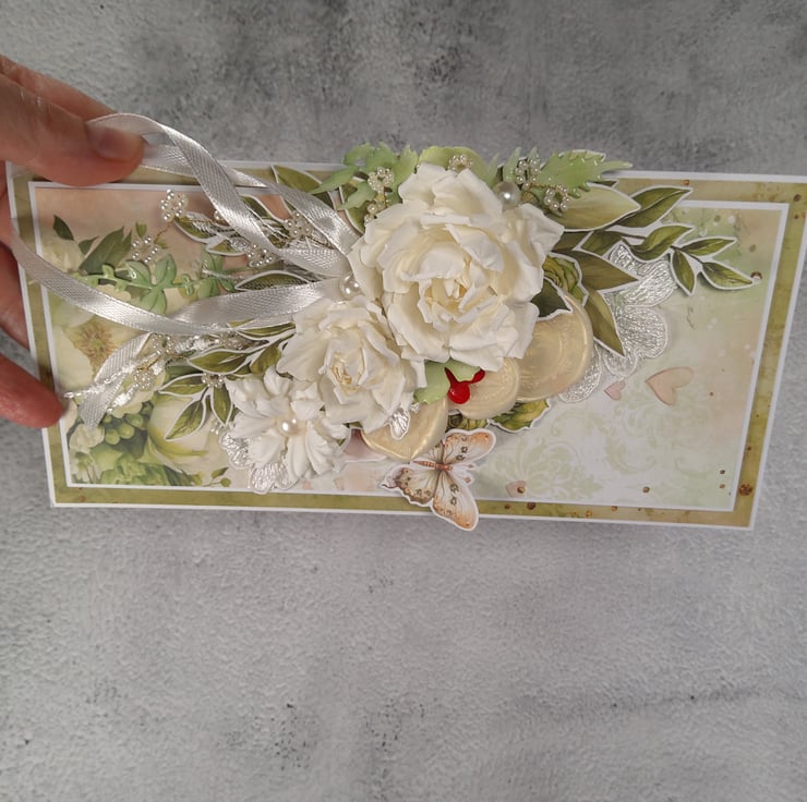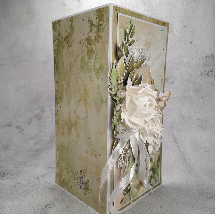 A beautifully handcrafted wedding card featuring delicate handmade paper flowers, elegant white blooms, silver accents and soft green leaves. The layered design creates a romantic, timeless composition — perfect for weddings, anniversaries or other special celebrations.