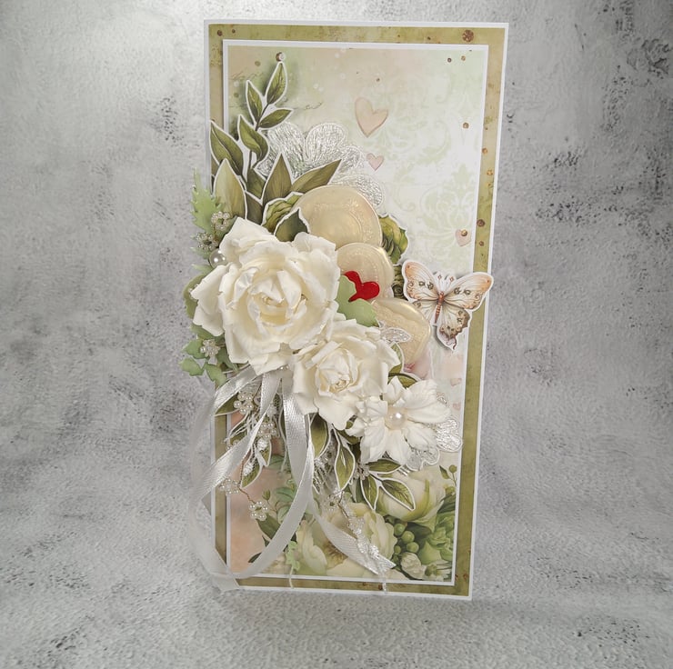 Each element is carefully arranged with attention to detail, making this card a unique keepsake for the happy couple.