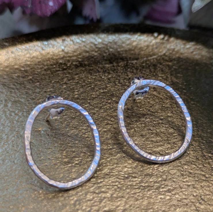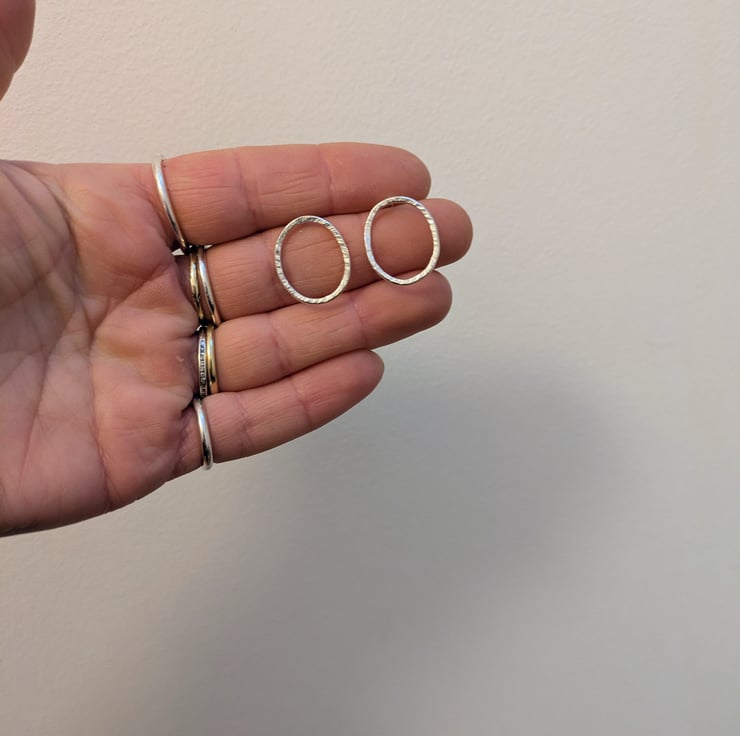 A lovely pair of sterling silver earrings with stud backs. A simple oval design with a hammered texture to catch the light, a classic staple pair.