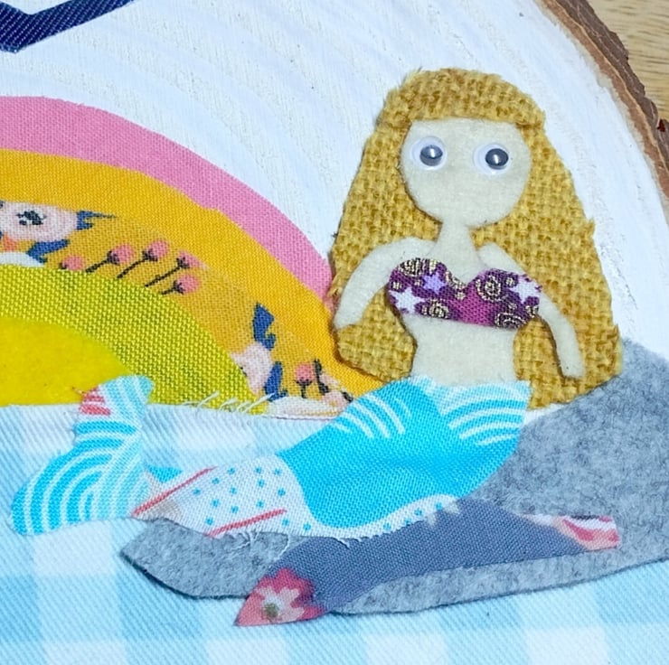 The picture is made using a mix of different fabrics and patterns on a painted real wood slice.