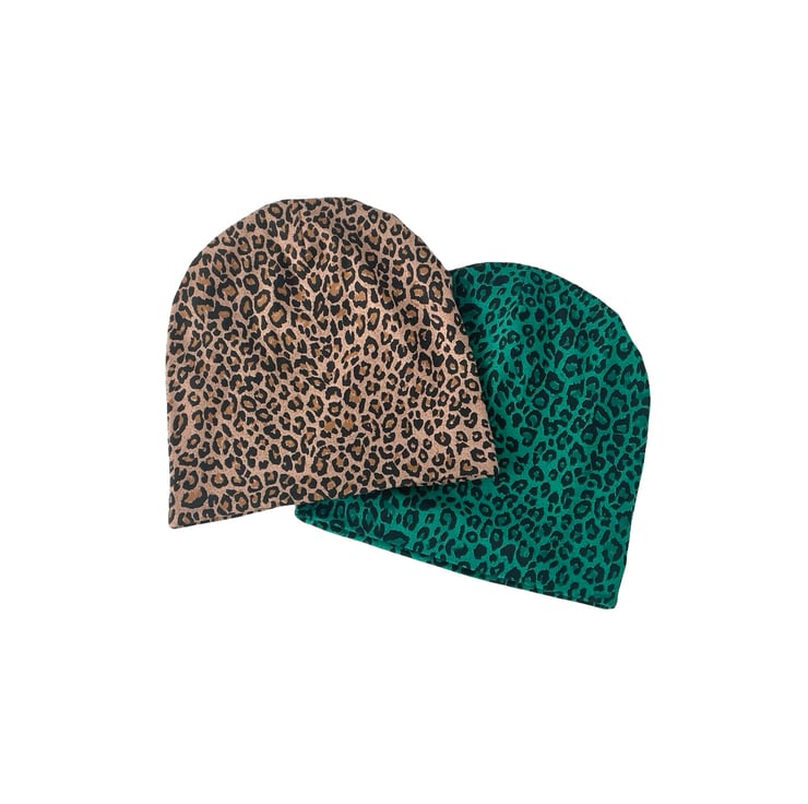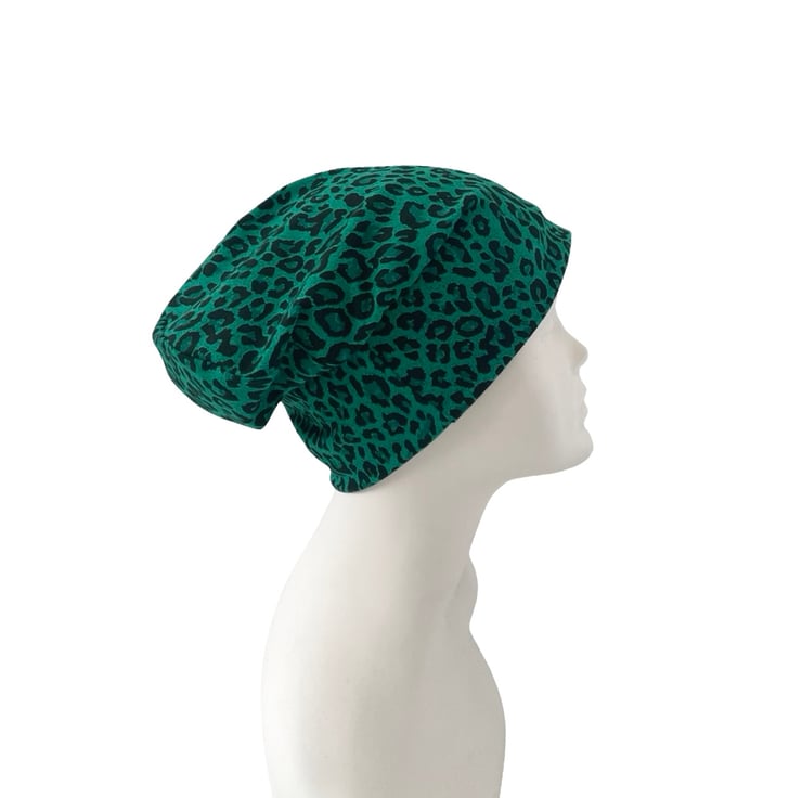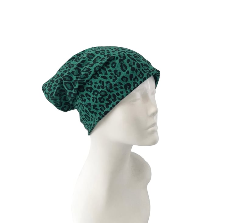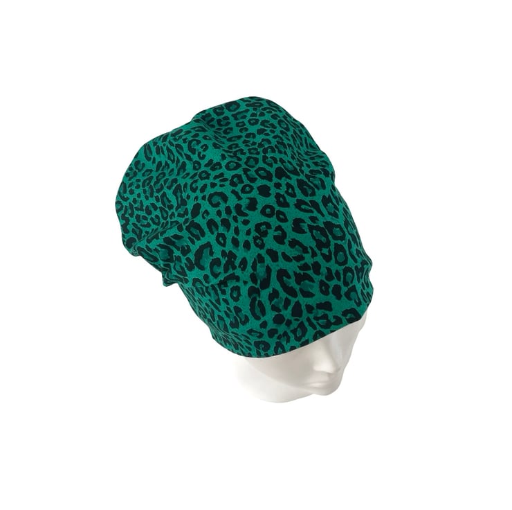 Green satin lined hat, Leopard slouchy beanie hat, Cotton chemo hair loss beanie