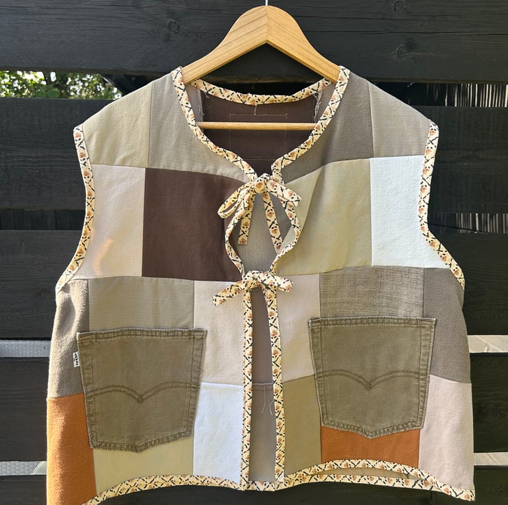 Women’s patchwork denim waistcoat in neutral tones of brown, beige and cream.