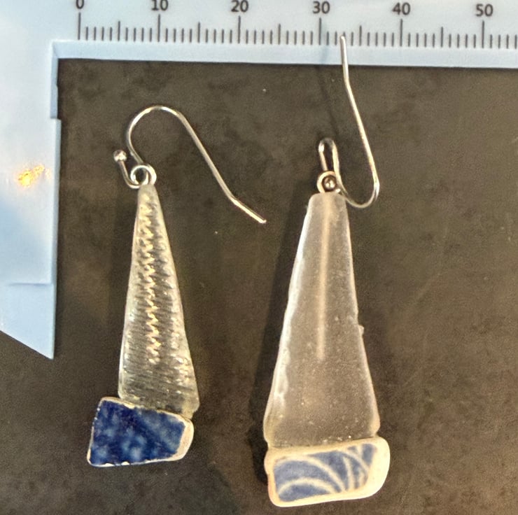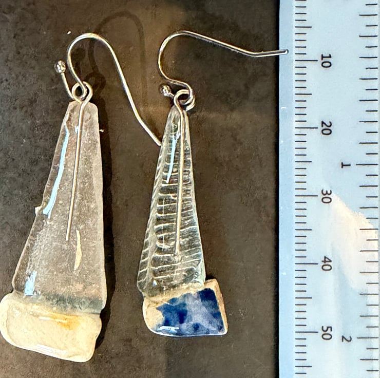 Clear sea sea glass and blue pottery made in pretty boat shape, resined together and on stainless steel silver earrings