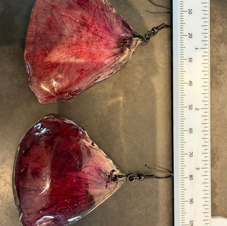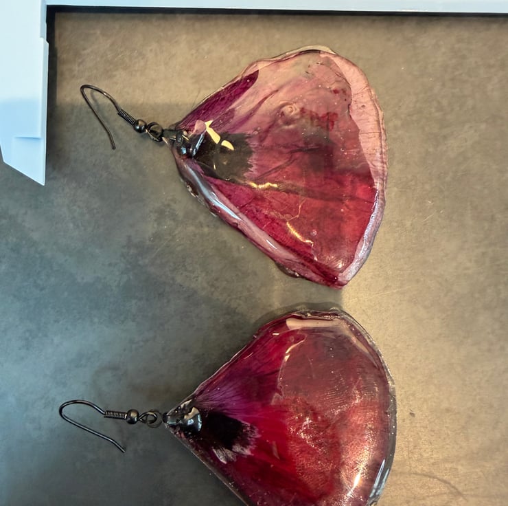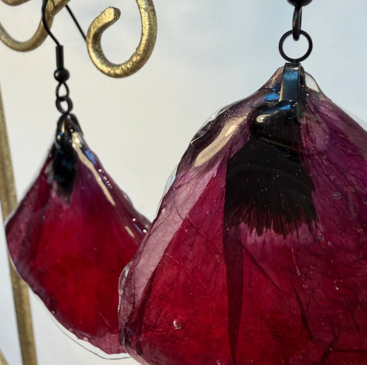 Poppies collected in hayle and resined in layers to create beautiful earrings on stainless steel black earrings