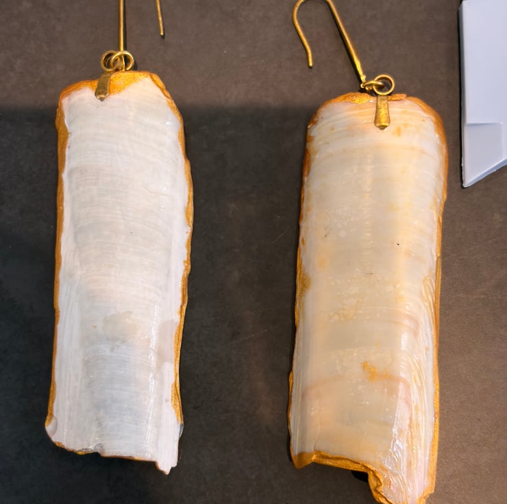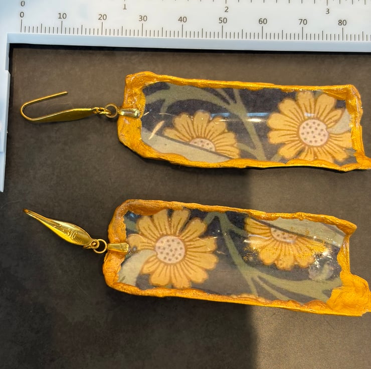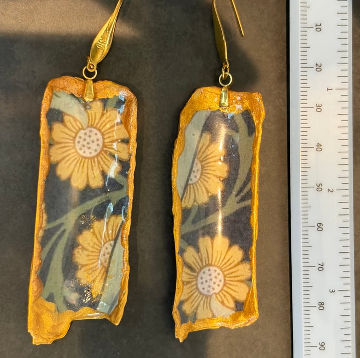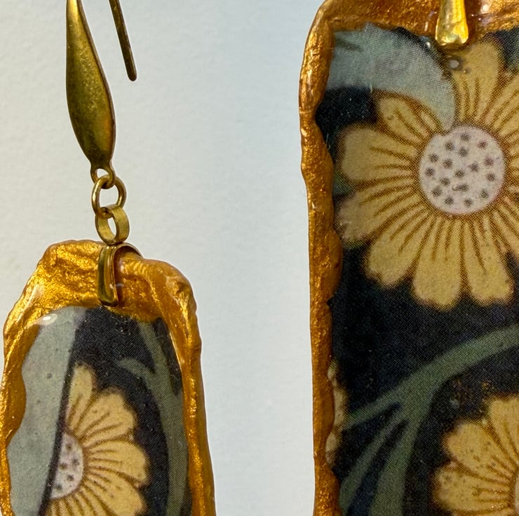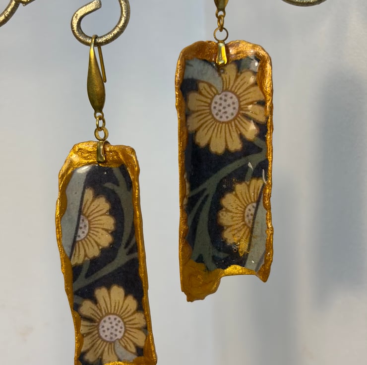Razor clam shell pieces collected in Cornwall, decoupaged William morris paper and resined with stainless steel gold earrings