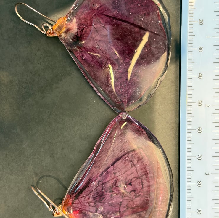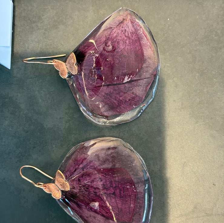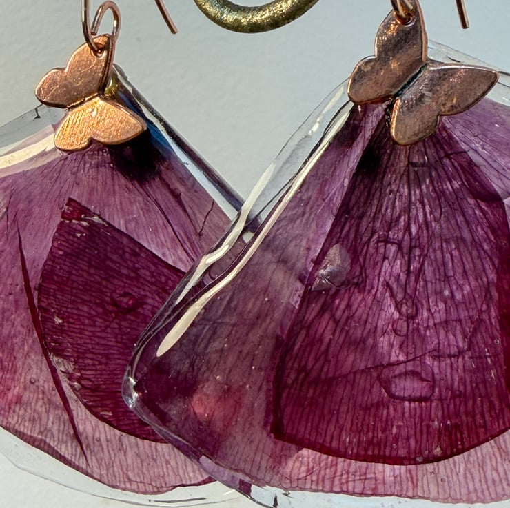 Layered Cornish poppies I collected from my garden hung on stainless steel rise gold earring with rose gold butterfly detail