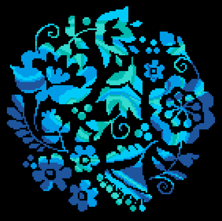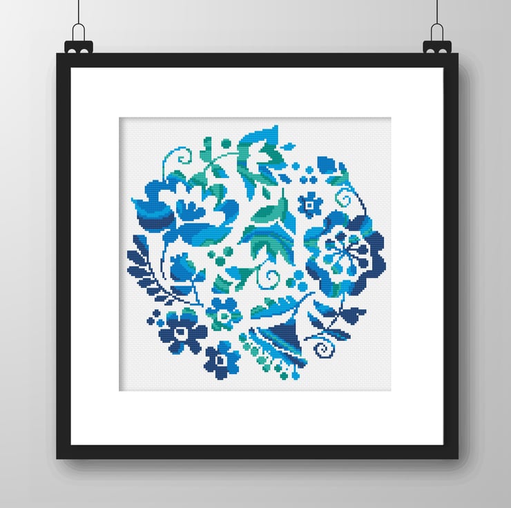 Cross stitch Ukrainian Folk Art Flowers on blue marbled swirly background - Floral modern counted cross stitch chart by Vivienne Powers - 224A