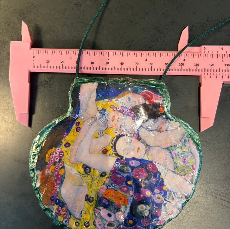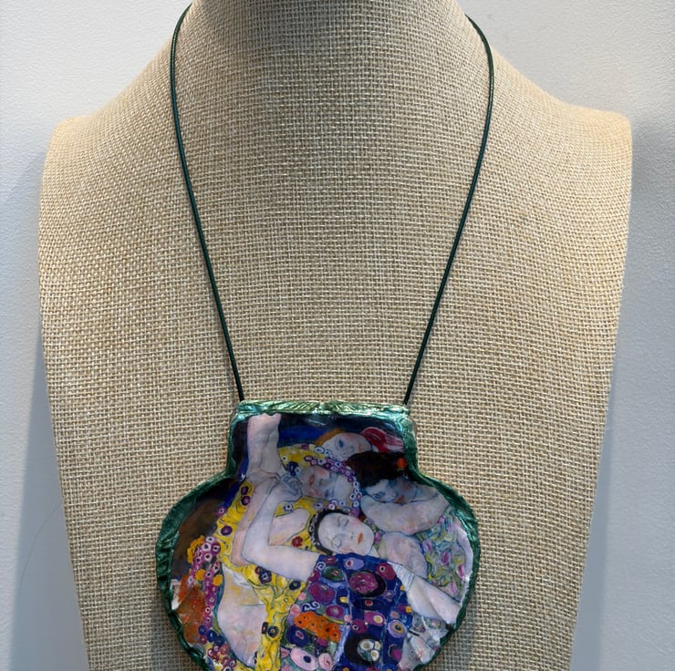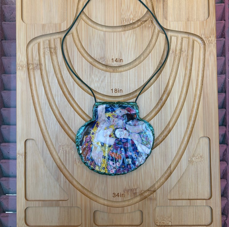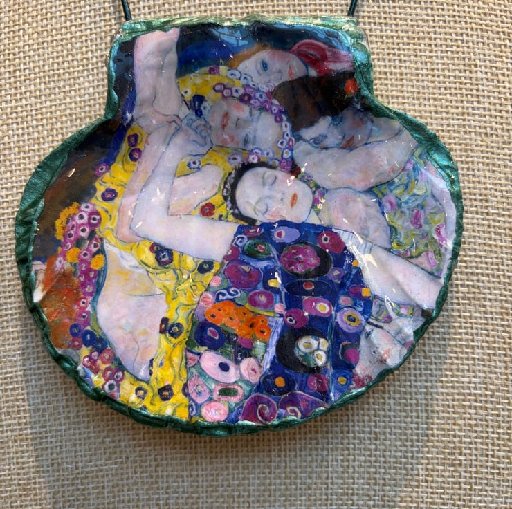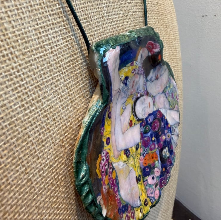 Made with a locally found scallop shell, decoupaged with Klimts beautiful image using modge podge and the resined hung with waxed cord and a pop clasp