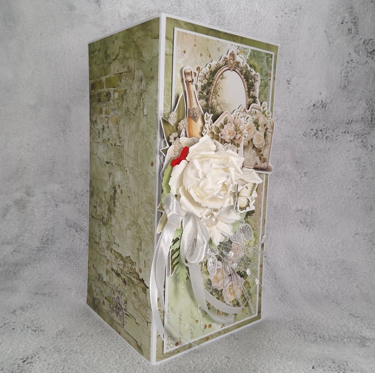 A romantic handmade wedding card created in a soft, elegant style — perfect to celebrate a special day of love and joy. The design features beautifully layered papers, delicate handmade paper flowers, pearls, and satin ribbons, all in subtle shades of ivory, cream, and green. The composition is enriched with elegant wedding motifs such as a champagne bottle, mirror, and butterfly, creating a timeless and refined look.