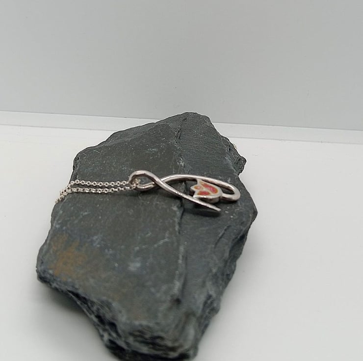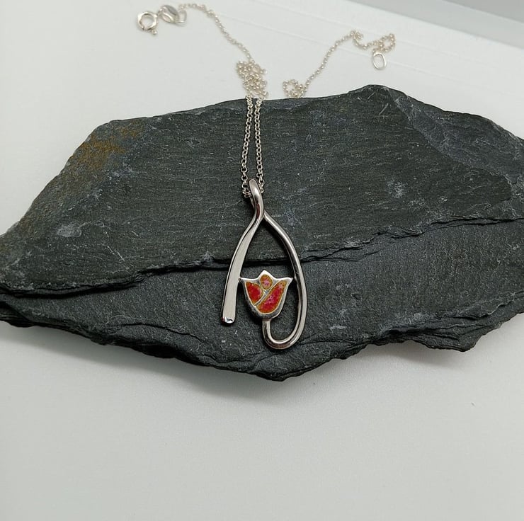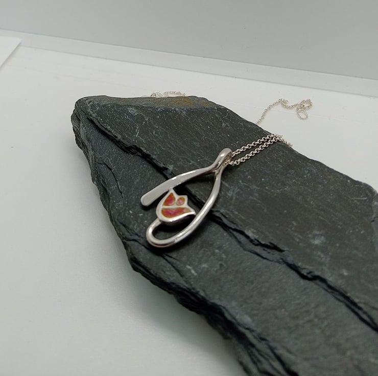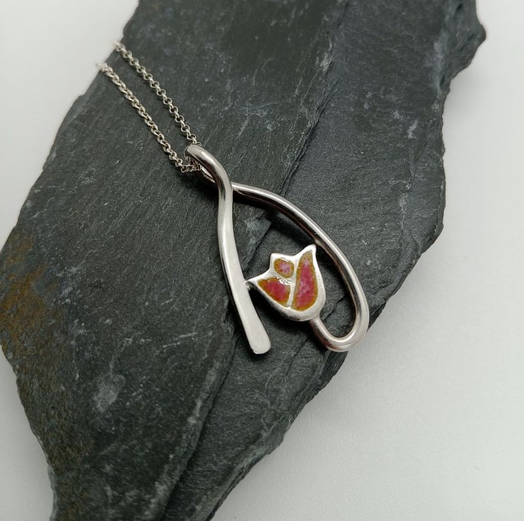 Sterling silver curve design pink peach colour glass enamelled tulip necklace.