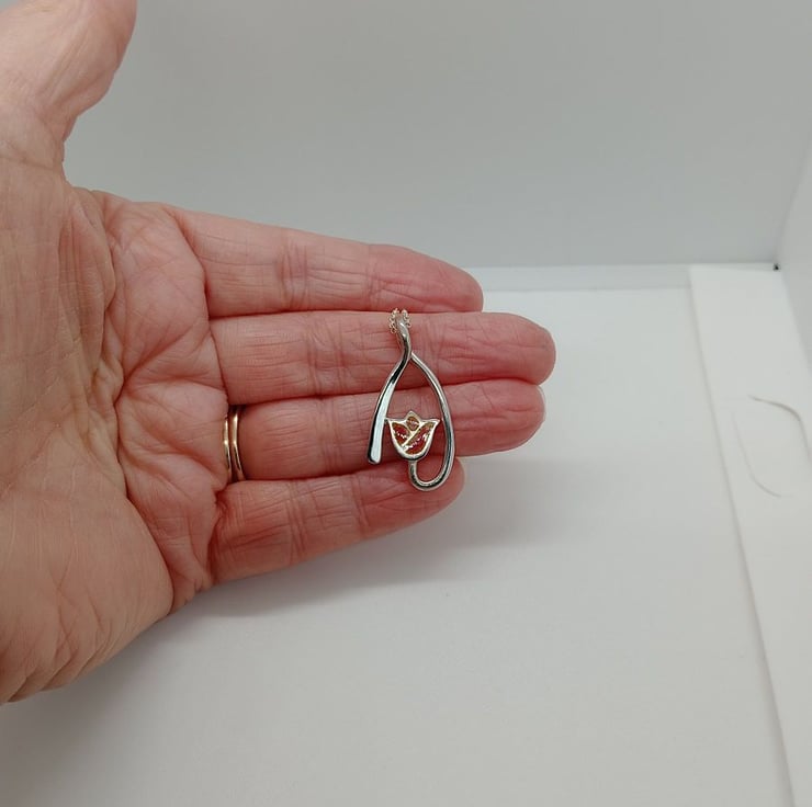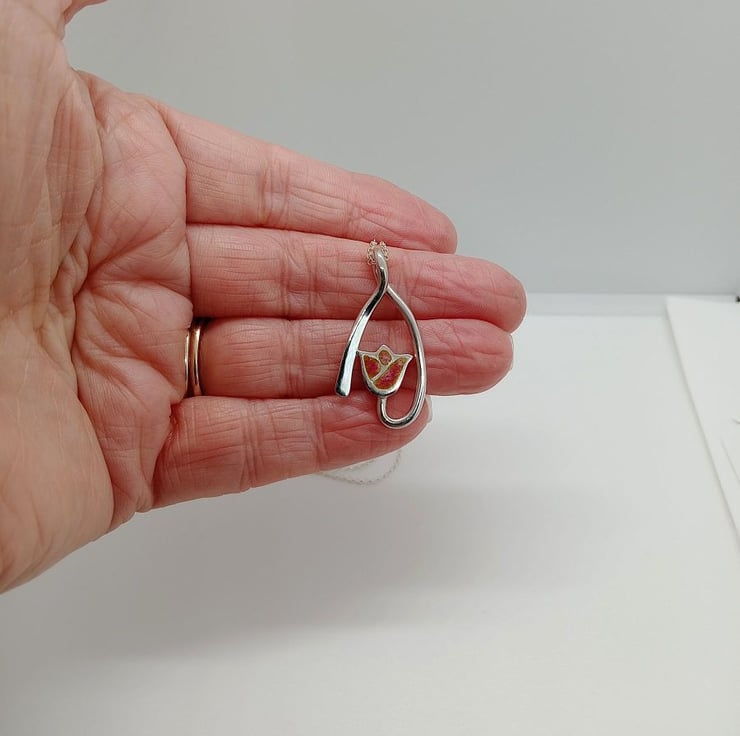 The sterling silver tulip pendant is handmade from solid sterling silver wire, shaped into a curve design with the stem from the bottom curving up the right side and creating the bail at the top before extending down to the left side, the tulip was made using the casting technique.