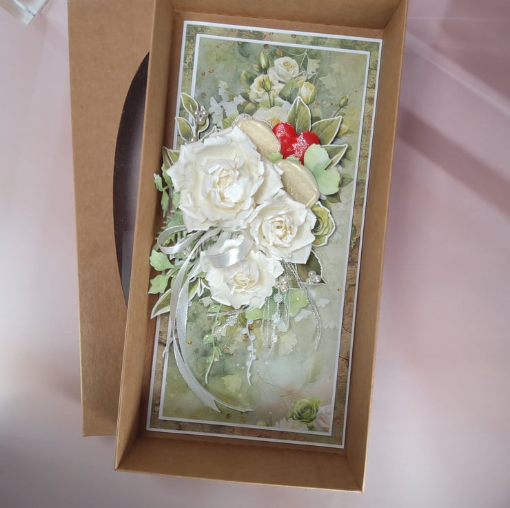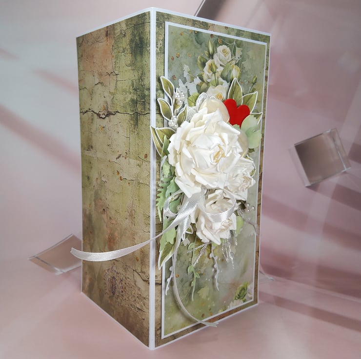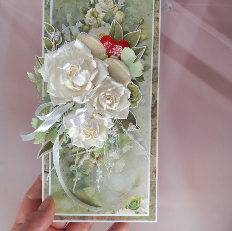 A romantic handmade wedding card created in elegant natural tones — perfect to celebrate a special day of love. The design features beautiful handmade paper roses, satin ribbons, pearls, and shimmering leaves, all arranged on softly layered scrapbook papers. Subtle hearts and floral motifs add a touch of warmth and romance.
