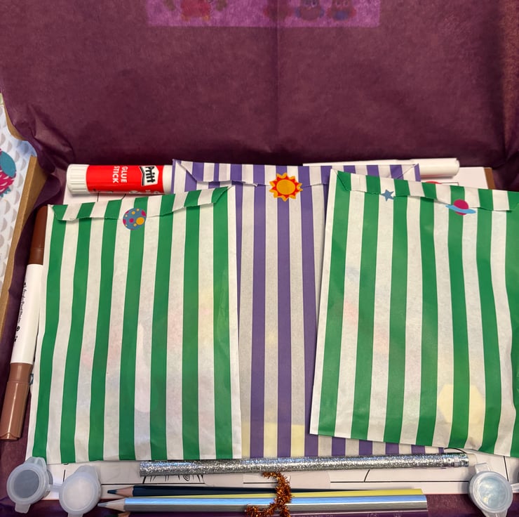 You will find an alien in the box and some space theme stickers to extend creative opportunities