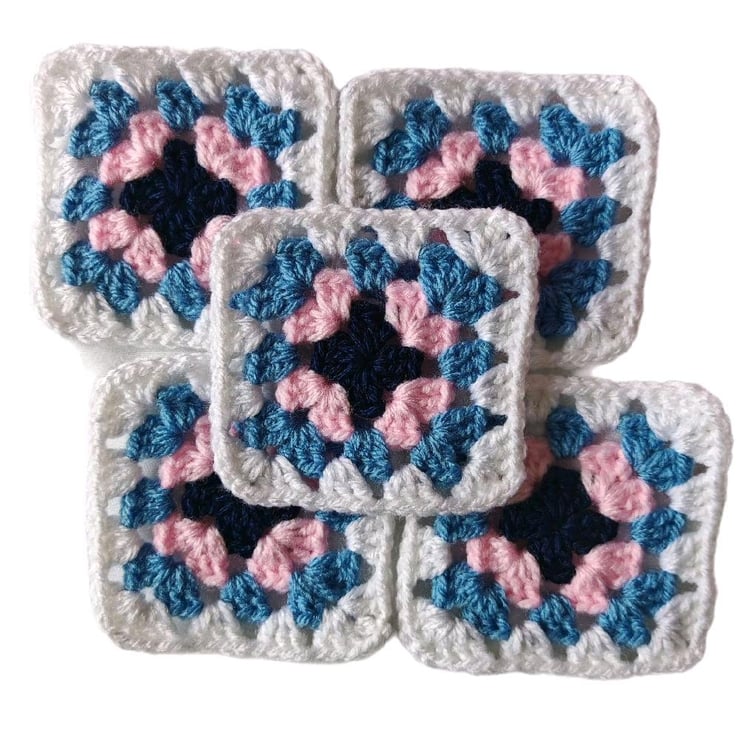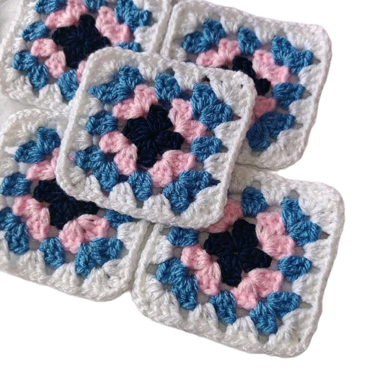 Imagine soft sunsets over a tranquil lagoon gentle blush pinks blending into cool sky blues, crisp whites for that airy lightness, and a subtle navy heart for depth and drama. That's the magic of our Blush Lagoon granny squares, hand-crocheted with love to bring vintage boho charm to your crafts. Each 3-inch square is a tiny masterpiece, perfect for mixing, matching, and creating something uniquely yours.