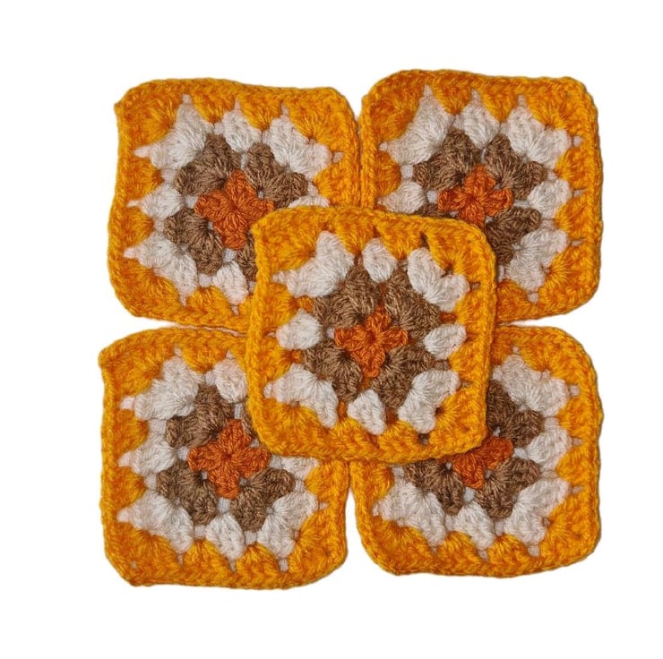 The product is a set of crochet granny squares in a Pumpkin Pixie Glow