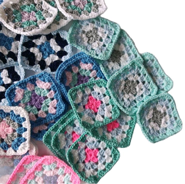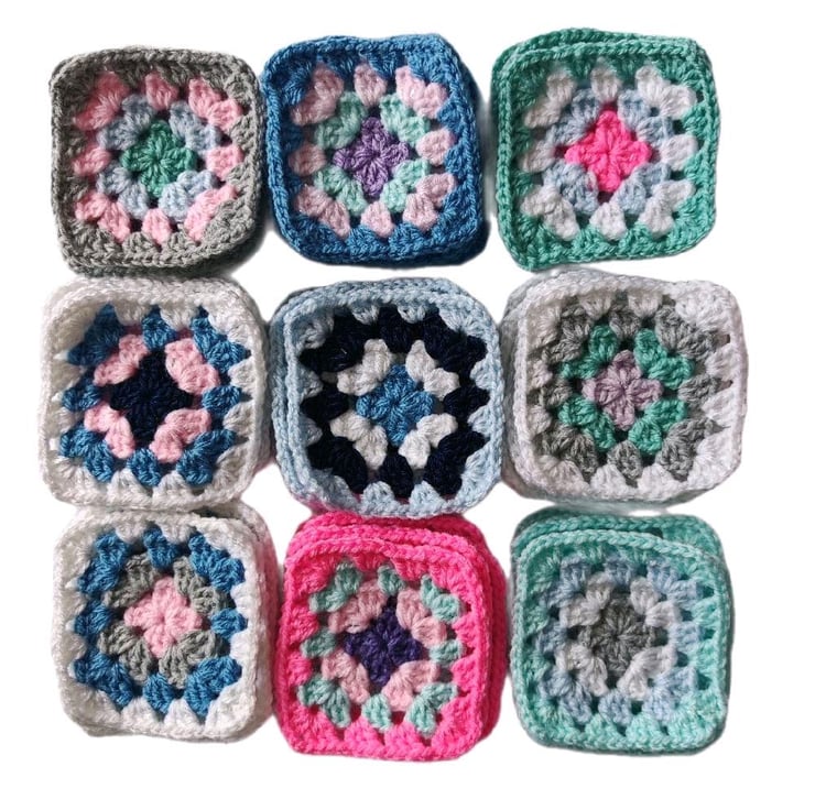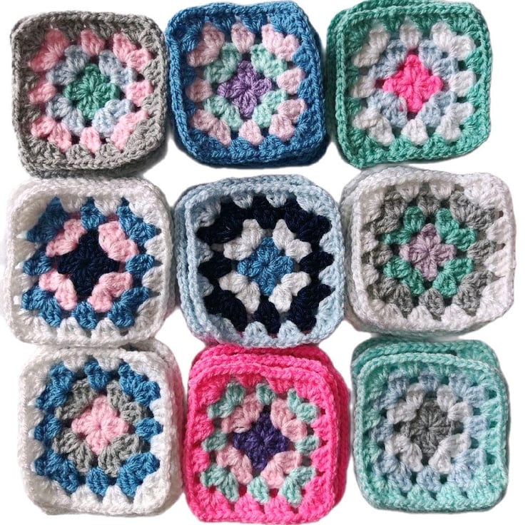 - Color Palette: A whimsical medley of pastel hues including blush pink, mint green, baby blue, lavender, soft gray, ivory, and subtle neutrals. Every square bursts with classic granny stitch clusters for that timeless, heirloom-worthy texture no two are exactly alike!