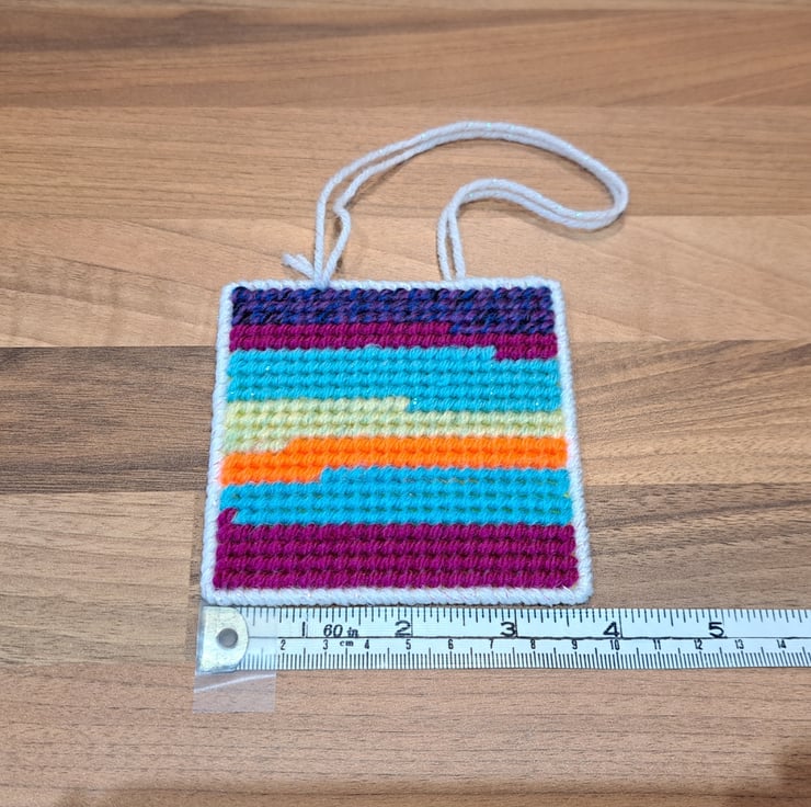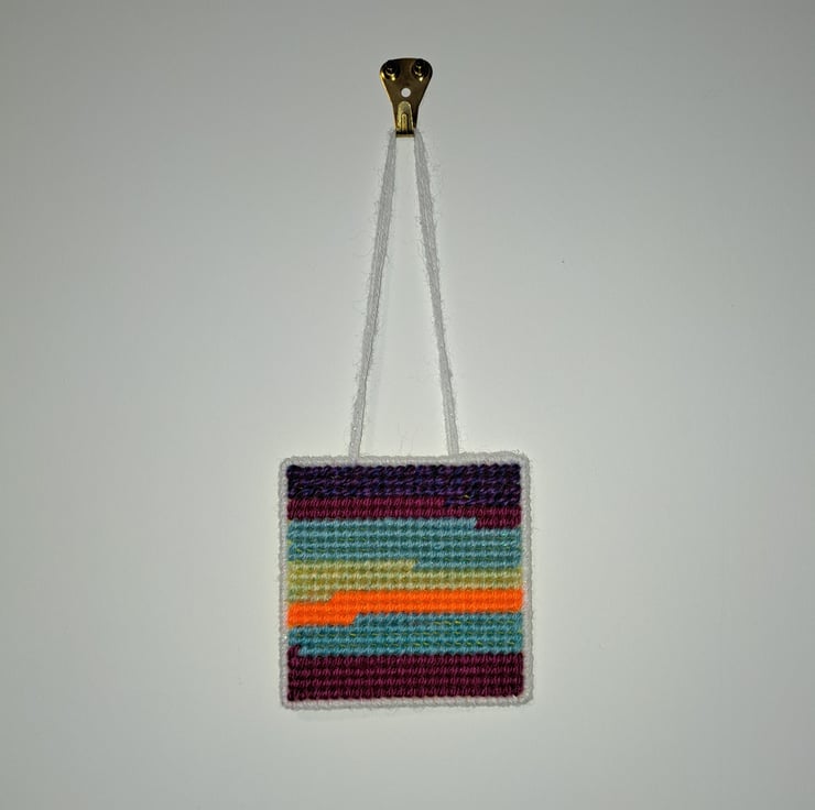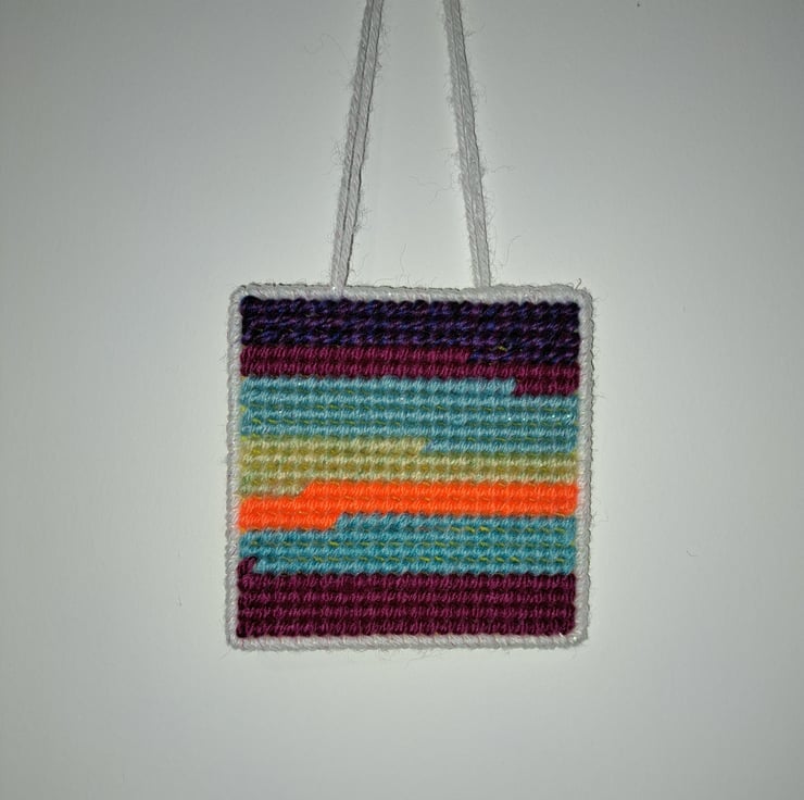 Small wall decoration with an abstract landscape pattern and glittery white edge. Yellow foam backing. Made using leftover yarn from previous projects so that nothing goes to waste.
