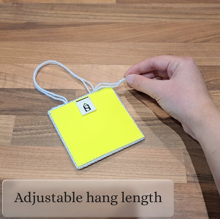 Hang length is adjustable - simply pull the string through and tie a knot to your desired length, and cut off the excess.