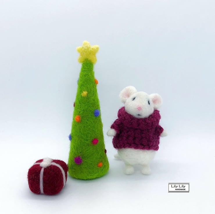 A bright and cheerful little Christmas tree and present Christmas decorations which have been hand needle felted by Lily Lily Handmade using coloured merino wool fibre. The Christmas tree, with colourful baubles and a yellow star on top, is a free standing decoration. The tree itself measures approximately 9cm and 3cm at its widest point. Perfectly sized for little mice :)