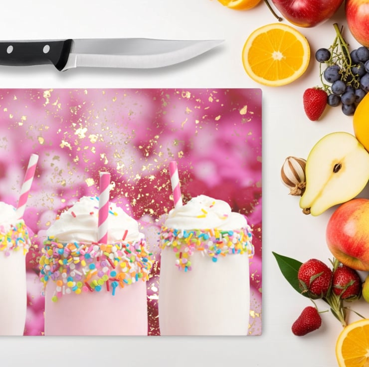 Indulge in a touch of nostalgic sweetness with this Creamy Milkshakes With Pink And Glitter Background glass chopping board. Featuring a whimsical design of frothy milkshakes against a dreamy pink backdrop sprinkled with glitter-like shimmer, this piece captures the joy and charm of a classic diner moment reimagined in art.
