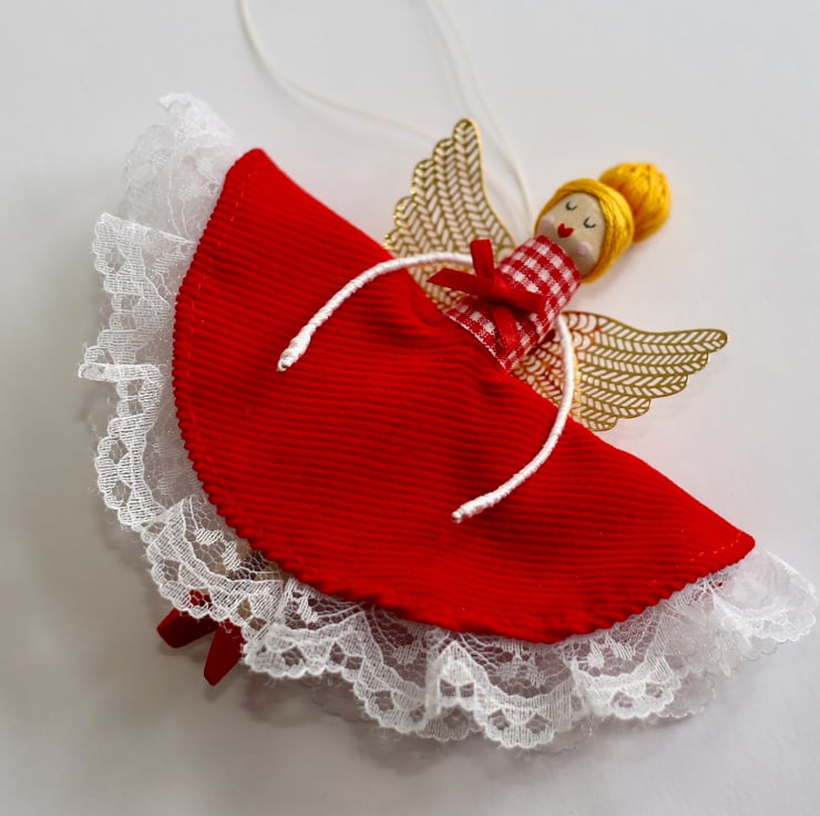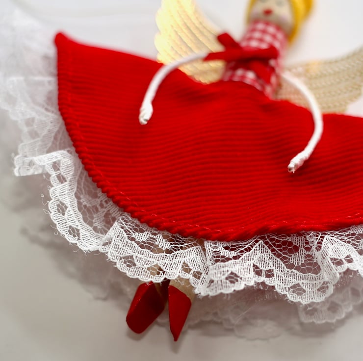 Hand painted shoes and face on the peg, lace trimming on the skirt, red fabric with ribbons and moveable arms.
