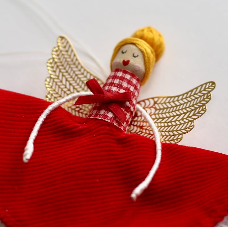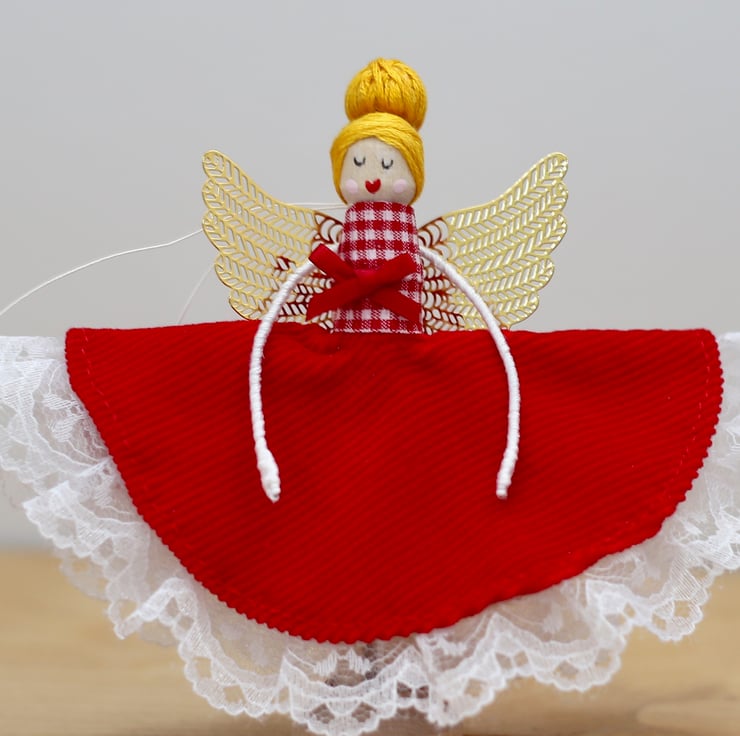 Bespoke handmade, hand stitched, hand painted, hand crafted wooden peg doll, with red fabric, red gingham ribbon and Golden hair (thread).