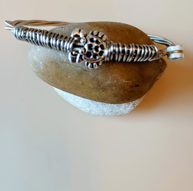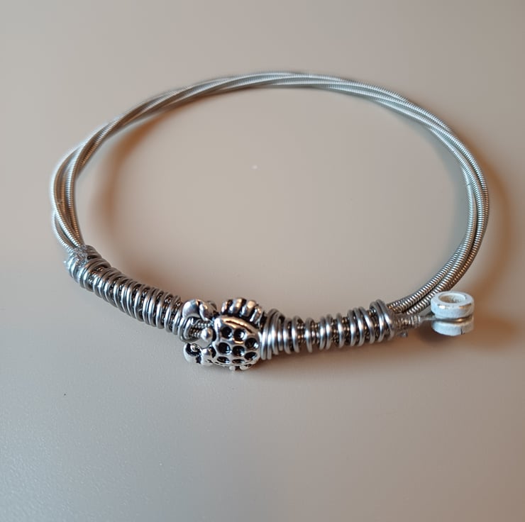 This is a bangle made from one of my son's used guitar strings ! It has been sterilised and cleaned. It features a Tibetan Silver crab charm and is wrapped with stainless steel wire. The white peg has been left on the string as part of the design. A very cool gift for any guitarist or musician, especially if their star sign is Cancer !