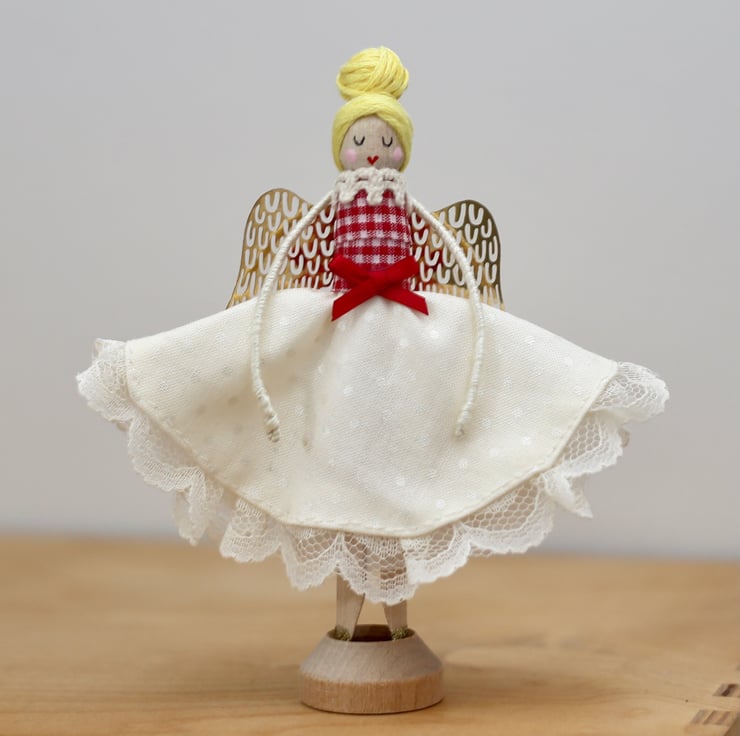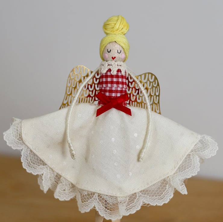 Bespoke handmade, hand stitched, hand painted, hand crafted wooden peg doll, with cream/dot fabric, red gingham ribbon and bow, and Blonde hair (thread).