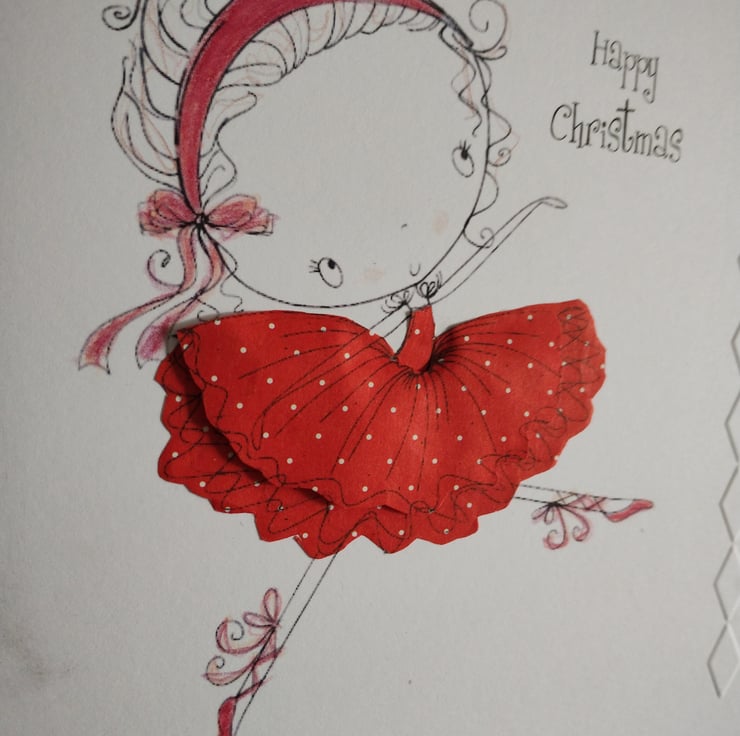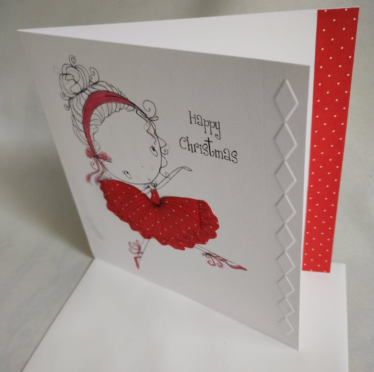 Sweet and simple handmade Christmas card featuring a little dancer, her dress is hand-cut from pretty red and white polka dot patterned paper and lifted slightly with foam pads on the second layer to give a little dimension. I've lightly coloured some of the image with pencil to create a delicate touch of colour.
