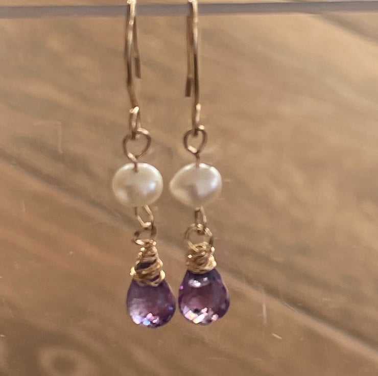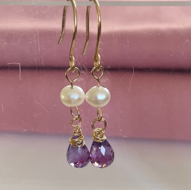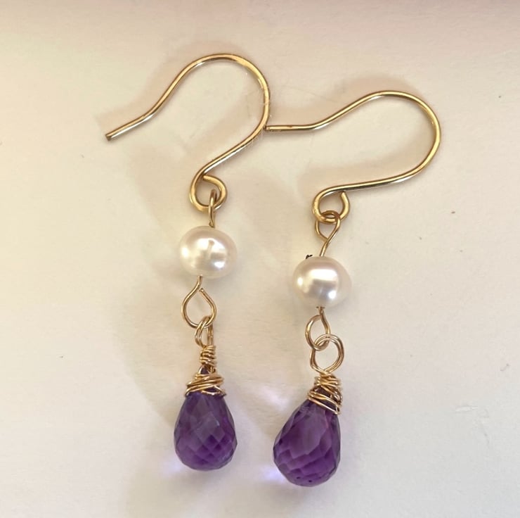 Beautiful faceted amethyst briolettes hanging with cultures pearls on 9ct gold filled wire. Hand made including the ear wires.