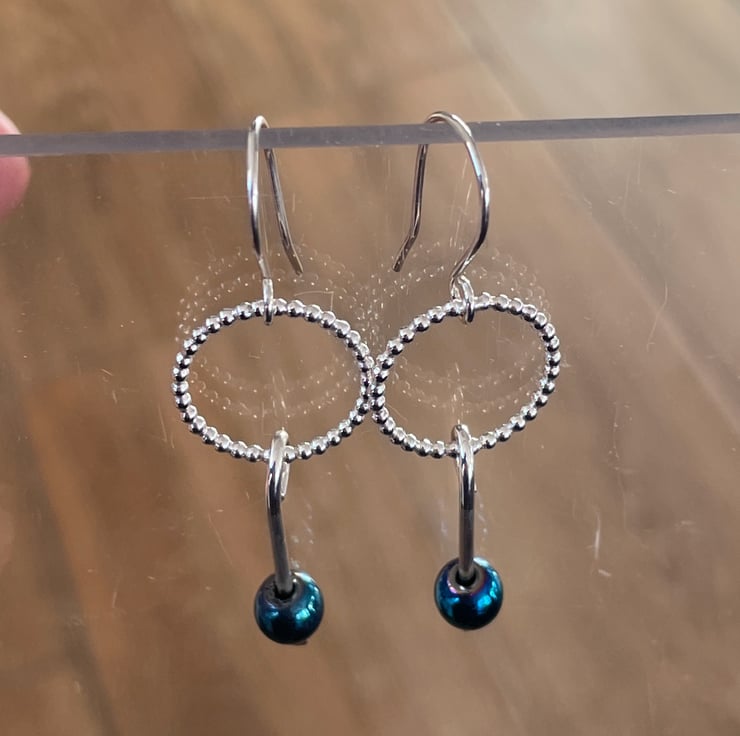 Hematite beads hanging on hand hammered 925 sterling silver with beaded wire hoops. The hoops measure 15mm and the earrings drop measures just under 4cm. These are unique earrings made by hand one pair at a time.