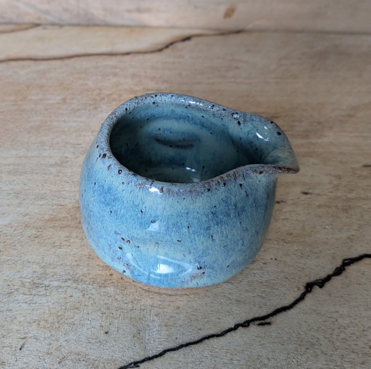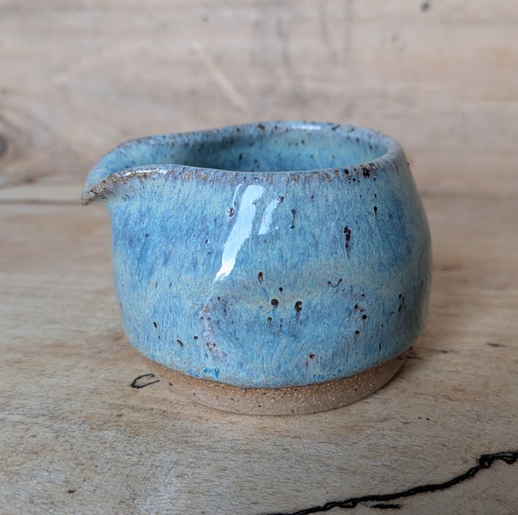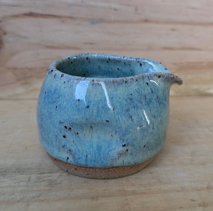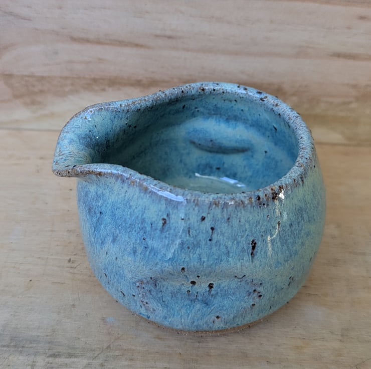 Great wee speckled clay with turquoise green glaze - milk/cream squat jug with a thumb & finger indentations in the sides. Some of the speckles in the clay also show through the glaze once fired. Perfect for one and as you can see from the last photo, there are other items in the same glaze combo on the shop. Fired to c1200 degrees (stoneware temperature) and this makes it more durable.