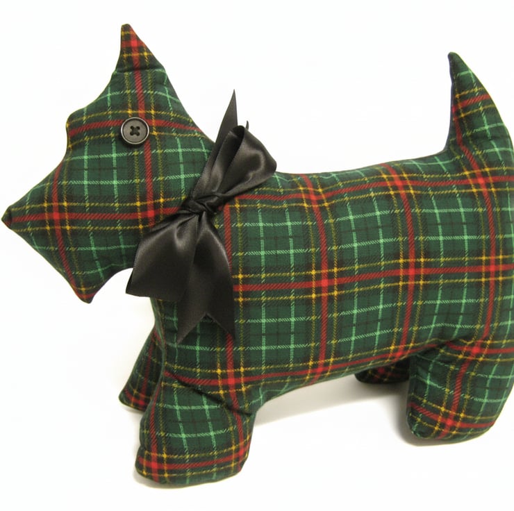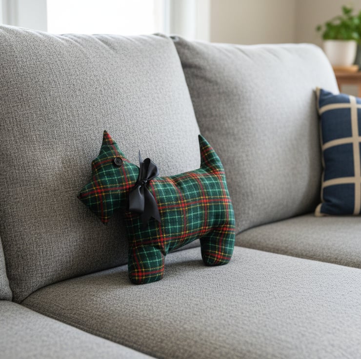 This charming, handmade Scottie dog is more than just an adorable accent—it's a delightful piece of home decor! Crafted from a beautiful tartan fabric, this stuffed figure captures the spirit and style of a classic Scottish Terrier.