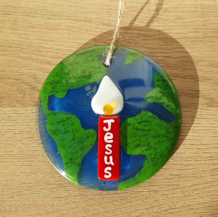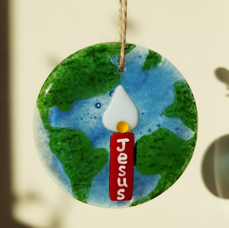 A fused glass hanging decoration celebrating Jesus the Light of the World. The world is made from glass powders on two layers of glass fused together in the kiln. Once fired I added the candle with the name of Jesus on and fused it a second time. Lastly I drilled a hole in the glass to add the jute string to hang it with.
