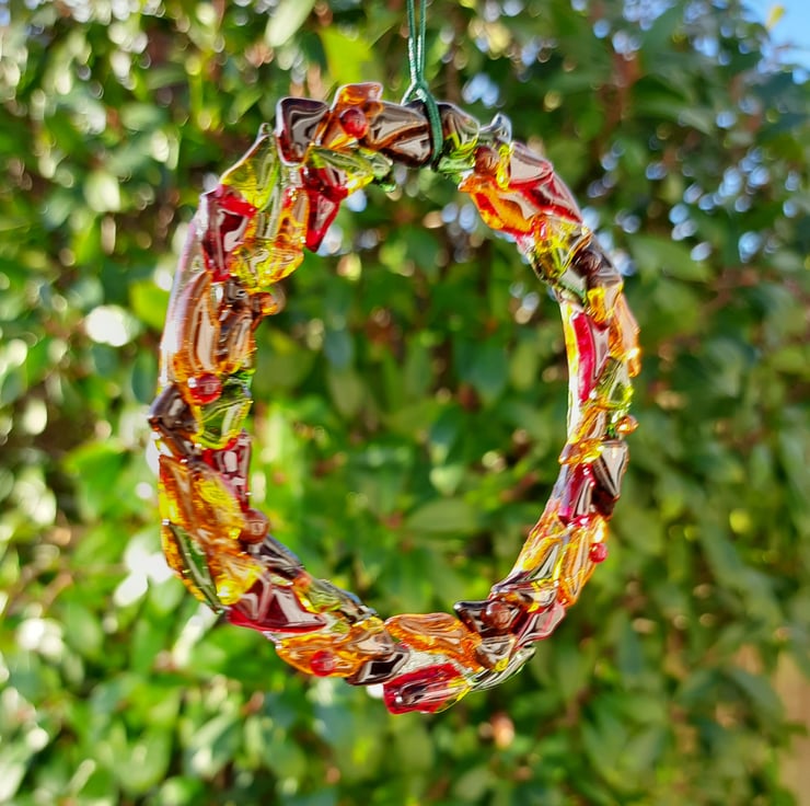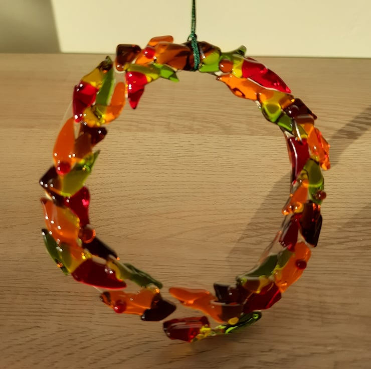 A fused glass autumn wreath made with red, green, orange, brown & yellow glass with some red and orange glass berries as well. This wreath is made up of 3 layers of glass, each layer being arranged on top of the one below and fused together in my kiln. It is made of many individual pieces of glass all hand cut, cleaned and arranged. The berries I pre made before adding to the wreath. A lot of time and love goes into each piece.