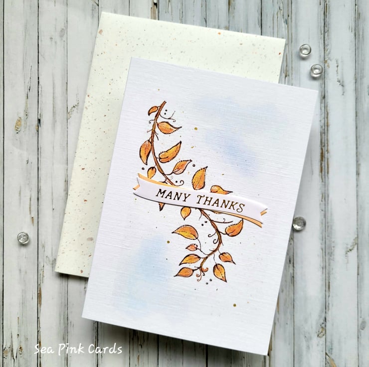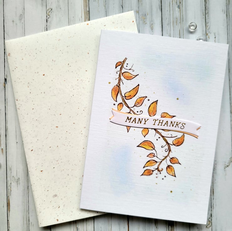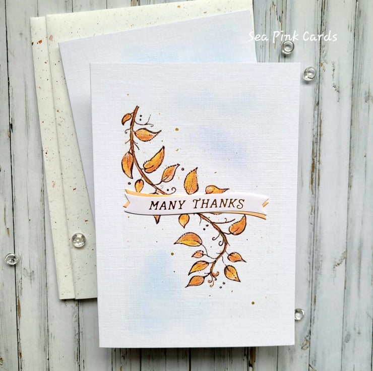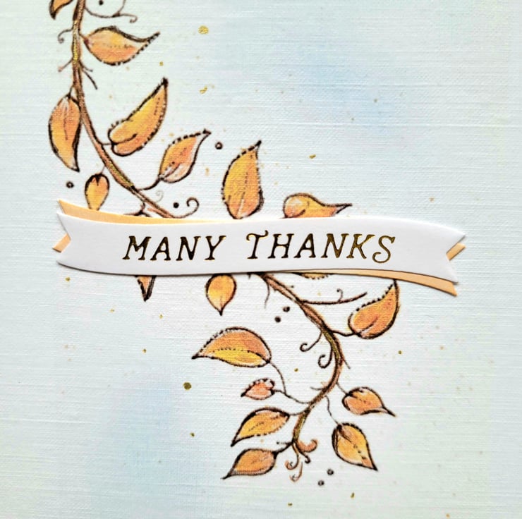 A set of two thank you cards, that are blank inside for writing your own personal message. The layered sentiment on the front reads, many thanks, which I have gold heat-foiled. The cards are 10.5 x 15 cms and have been reproduced from my own original artwork. Featuring a delicate twig and leaves in lovely coppery tones of gold and orange, in a clean and simple design. This card set has hand-finished details added with a water-based glimmer pen, which adds subtle shimmer that can be seen when the cards catch the light.