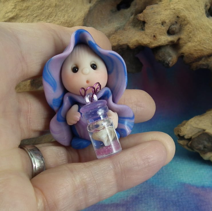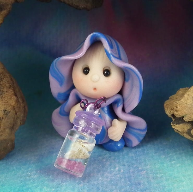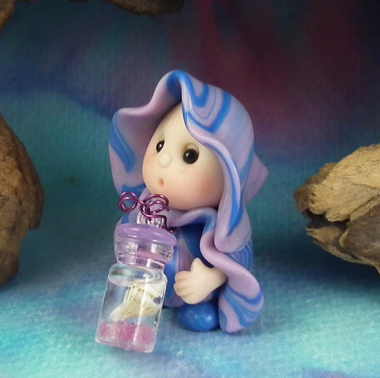 This is a 'one of a kind' creation having been entirely handmade without the use of moulds here at my studio on the Sussex Coast. Modelled with artist blend polymers, blushed before sealing with lacquer, Zella has sparkling black onyx eyes and variegated robes. Zella the Beachcomber Gnome is just one and a half inches tall.