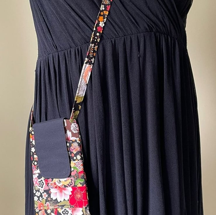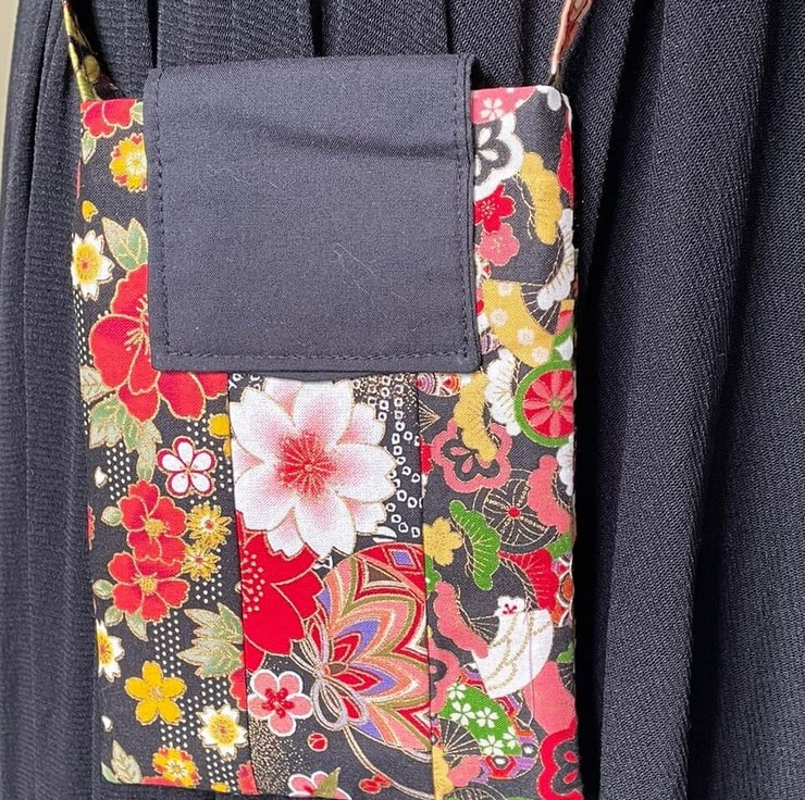 Beautiful handmade mini crossbody bag in pretty Japanese fabric patchwork. The bag has a front pocket and a flap with a velcro closure. The strap is extra long for ease of wearing over the body. Fully lined in plain black fabric.