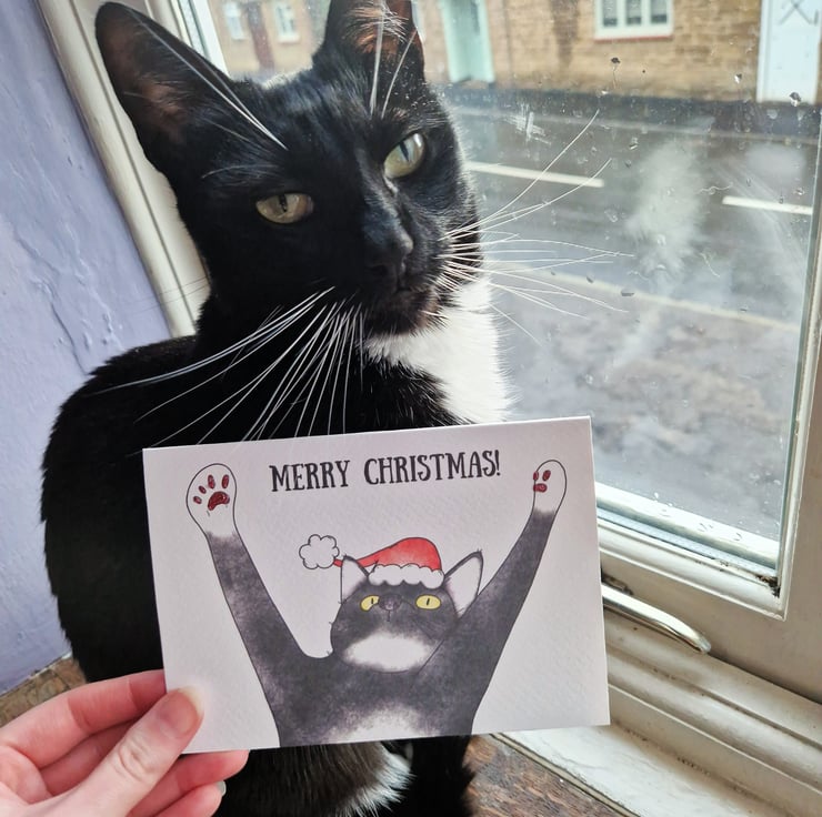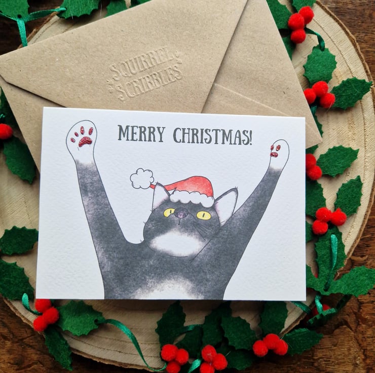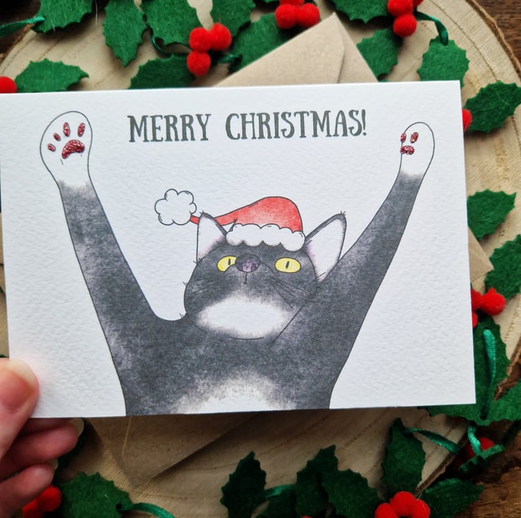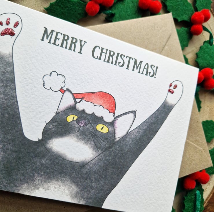 A tuxedo cat Christmas card, a purrfect way to send some merry Christmas cheer to friends, family and cat lovers alike! This funny A6 Christmas card is handprinted on textured card and glittered by hand! (P.S: If you would like to purchase multiple cards, there are Christmas card 'choose your own bundle deals' available in my shop for this month!)