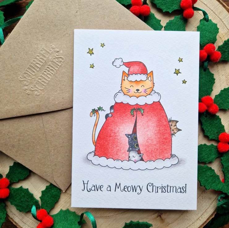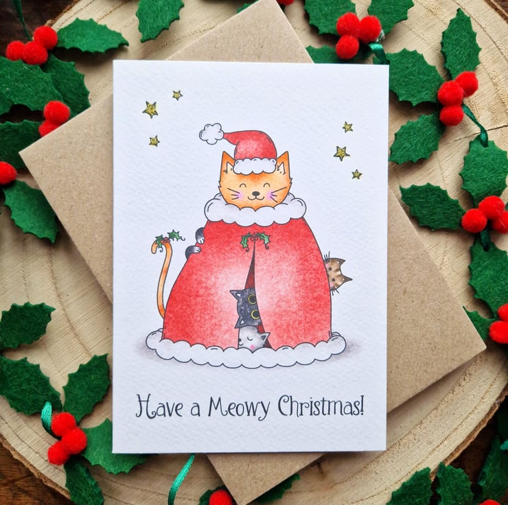A very meowy Christmas card! A purrfect Christmas card for friends, family and cat lovers alike! This funny A6 Christmas card is handprinted on textured card and glittered by hand! (P.S: If you would like to purchase multiple cards, there are Christmas card 'choose your own bundle deals' available in my shop for this month!)