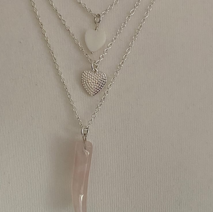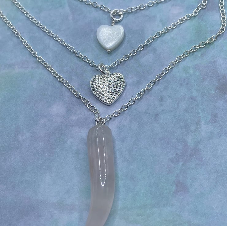A set of 3 layered necklaces, featuring a rose quartz horn tooth charm, silver plated heart and natural mother of pearl heart charms. They're on silver plated chains of varying lengths with individual clasps so you're free to wear one, two or all three layered together for a statement look, the choice is yours! Each necklace has a silver plated extender chain with a tiny rose quartz stone to add a professional finish.